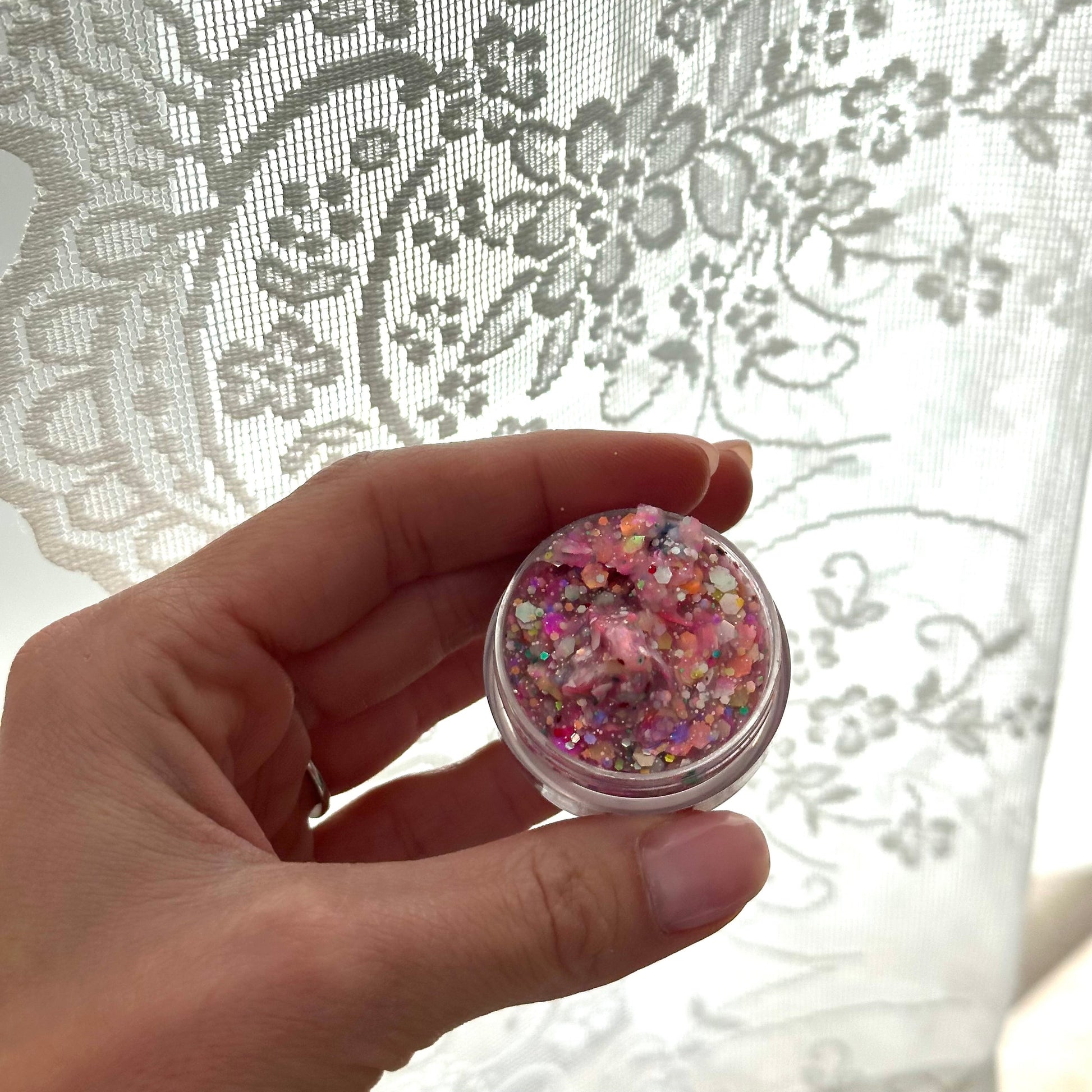 Pink hair glitter with colorful add ons. Includes colorful flower clay pieces