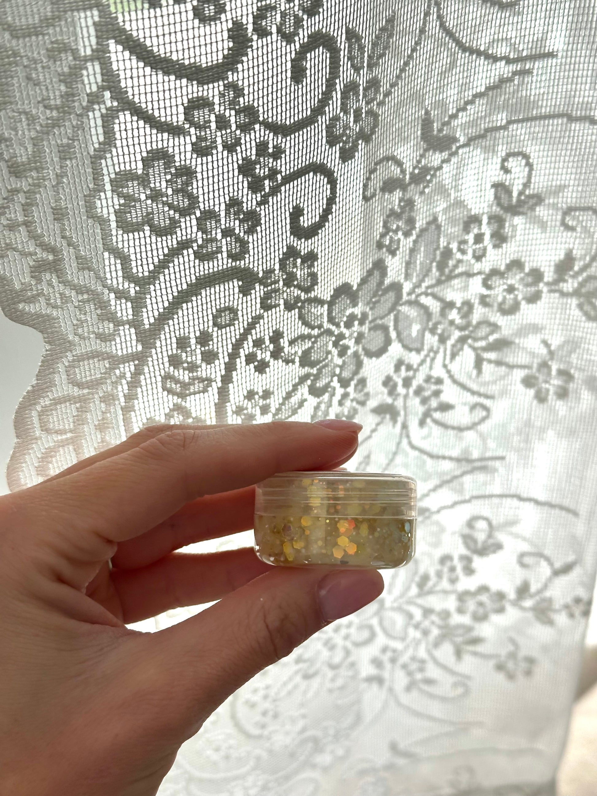 Aqua (Distilled Water), Xanthan Gum, Glycerin, Polyethylene Terephthalate (and) Polyurethane-11 (and) Aluminum Powder (Glitter), Phenoxyethanol (and) Caprylyl Glycol