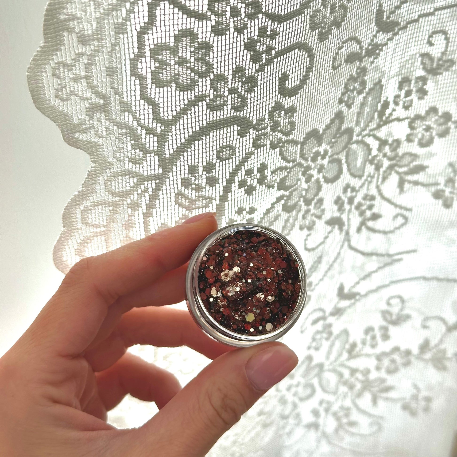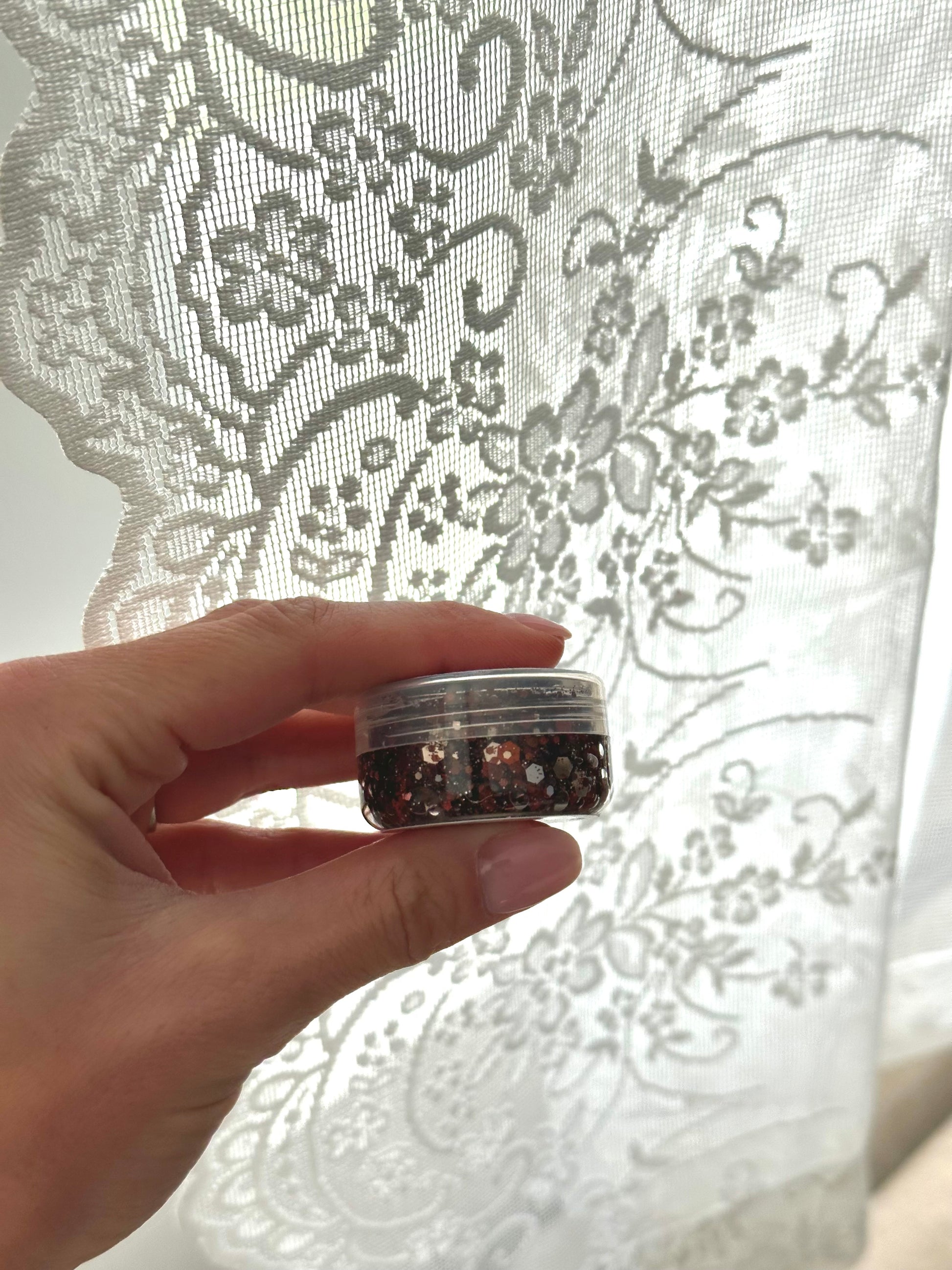 Dark brown glitter with subtle silver and champagne for added sparkle .