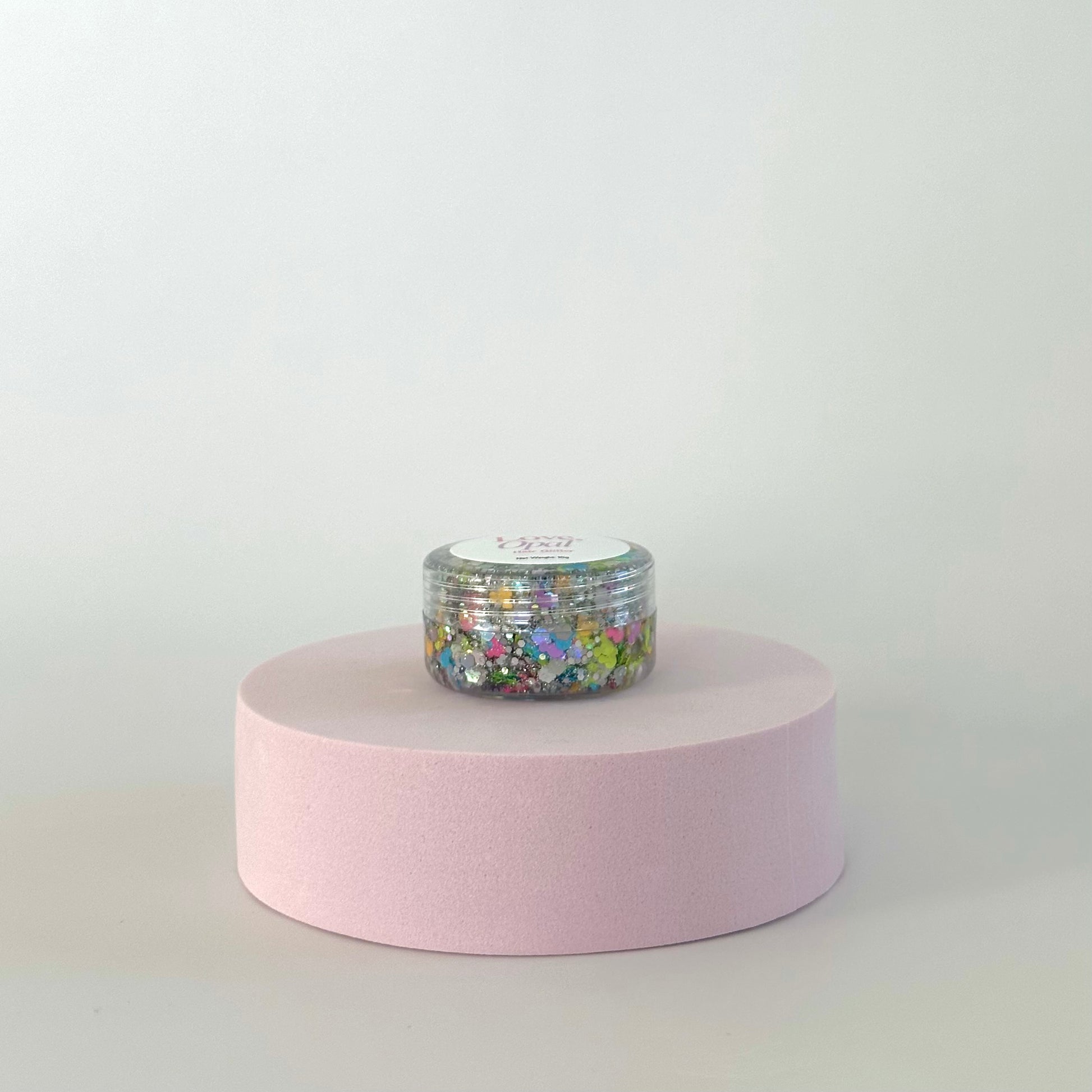 Aqua (Distilled Water), Xanthan Gum, Glycerin, Polyethylene Terephthalate (and) Polyurethane-11 (and) Aluminum Powder (Glitter), Phenoxyethanol (and) Caprylyl Glycol